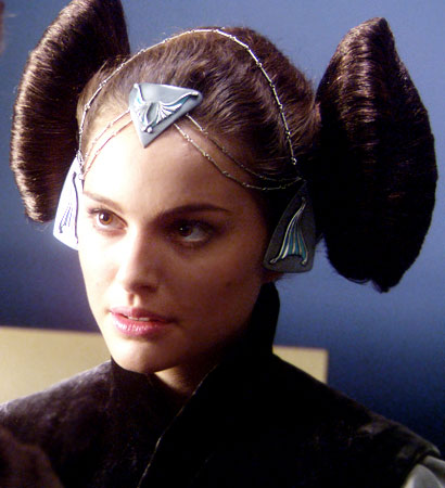 Portman was also in the utterly dire Star Wars prequels. Starting with the Phantom Menace, during which the make-up crew tried to replicate the equally daft Princess Leia bun-do with this, sort of, croissant thing. Yes.